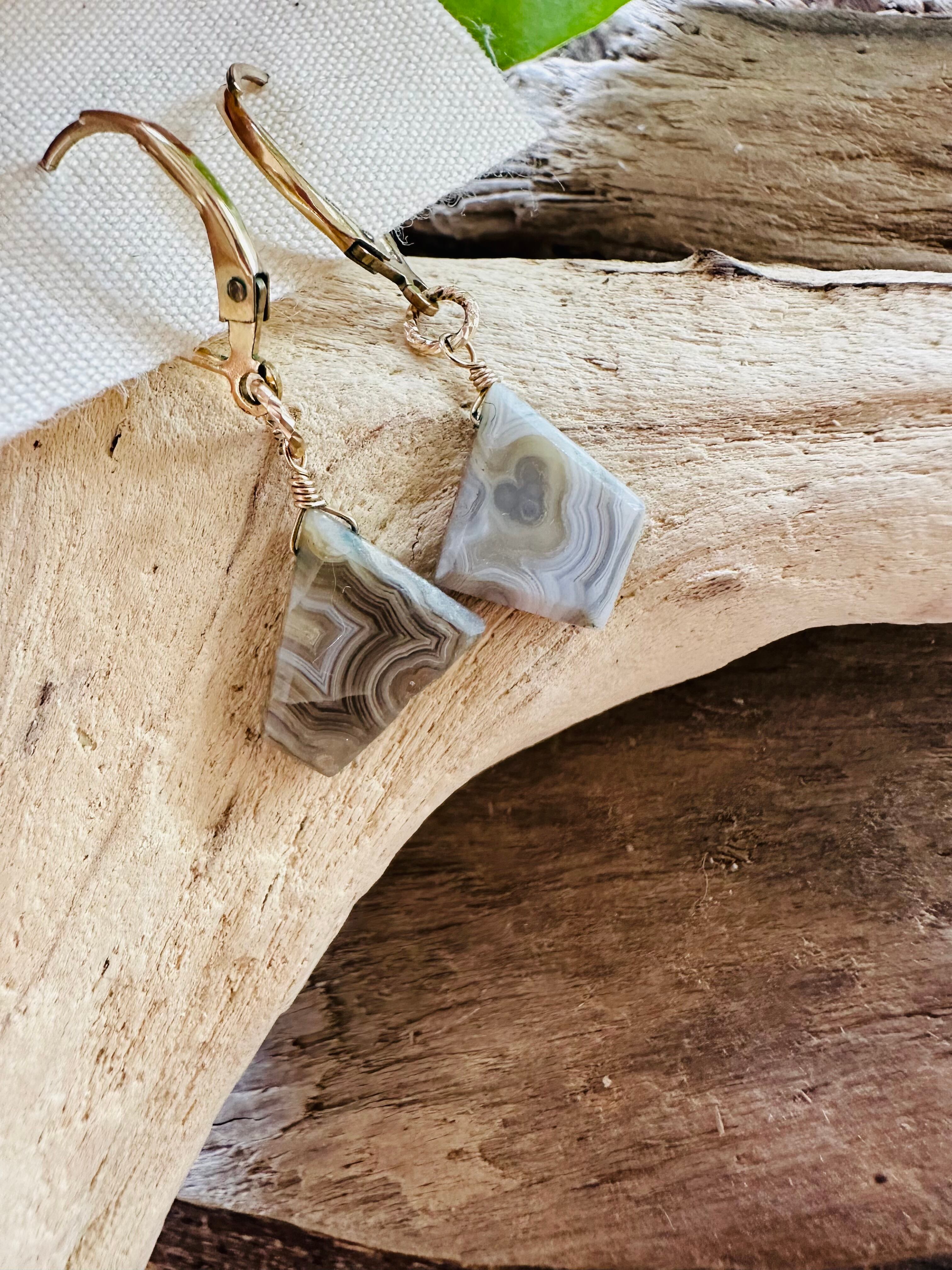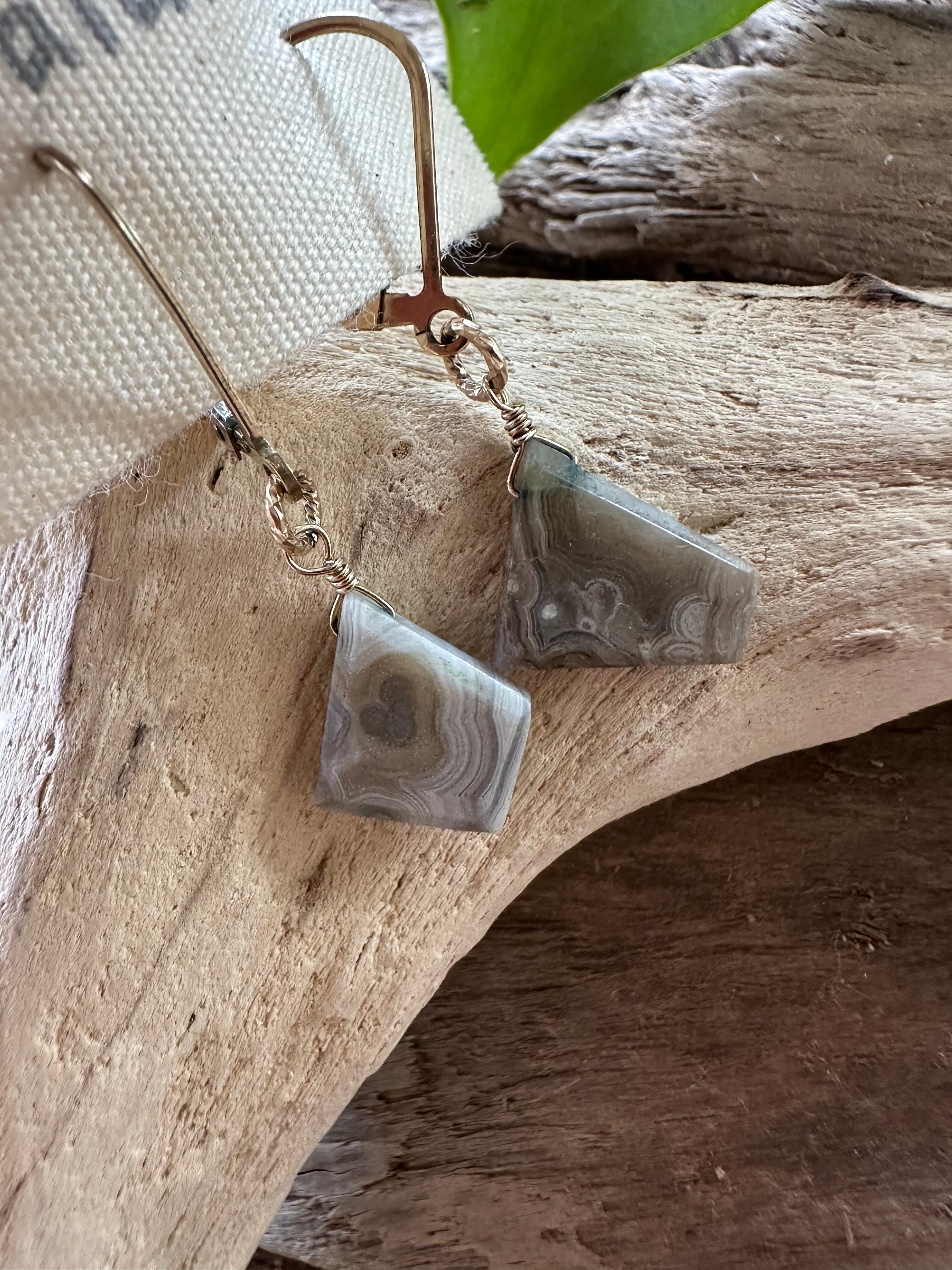 1点もののハンドメイドピアスで、ラグナレースアゲートの美しい模様が特徴です。